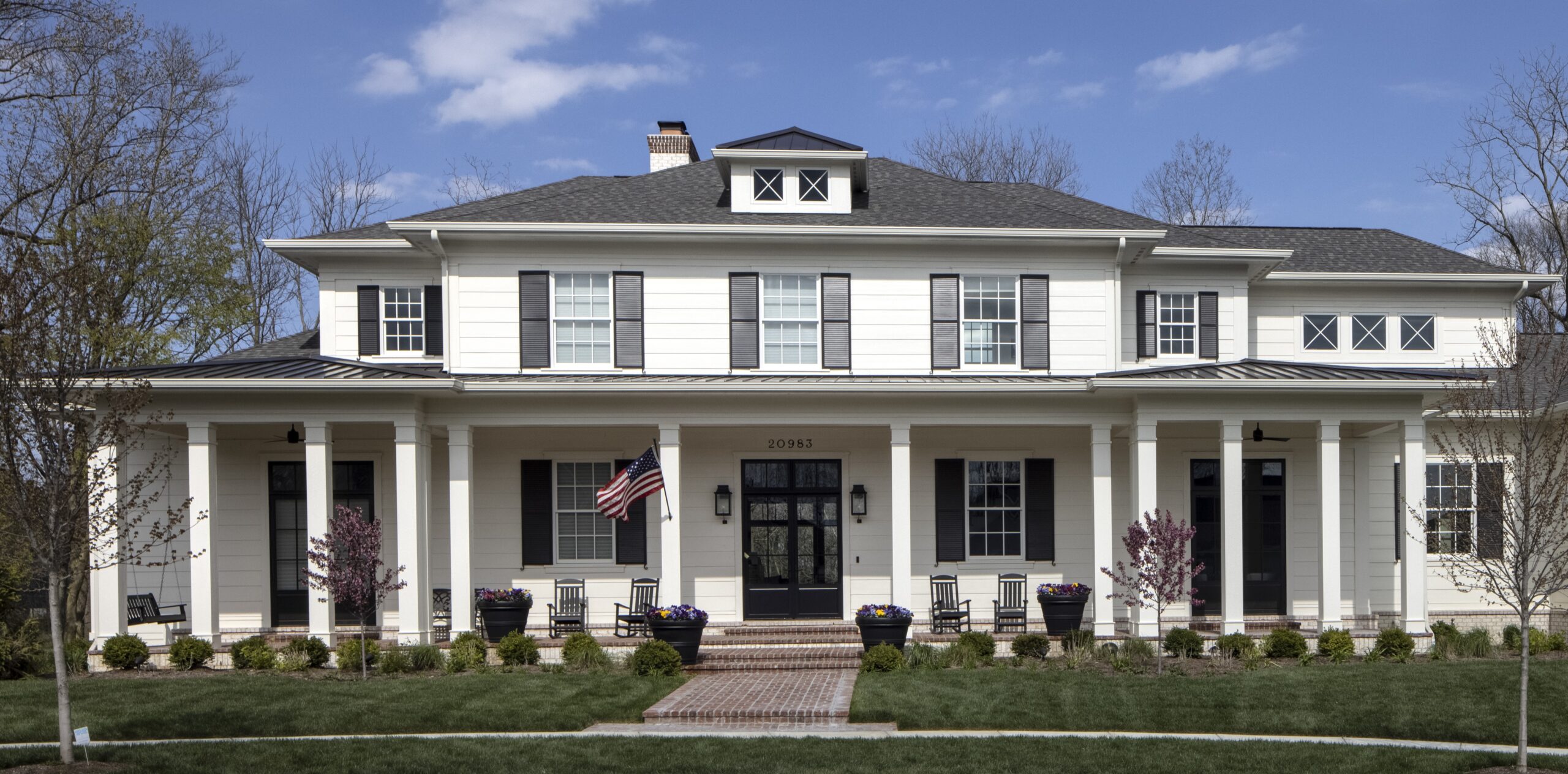 A stately, symmetrical main façade made to feel a bit more modern by the squared porch ends capped with metal roofs.