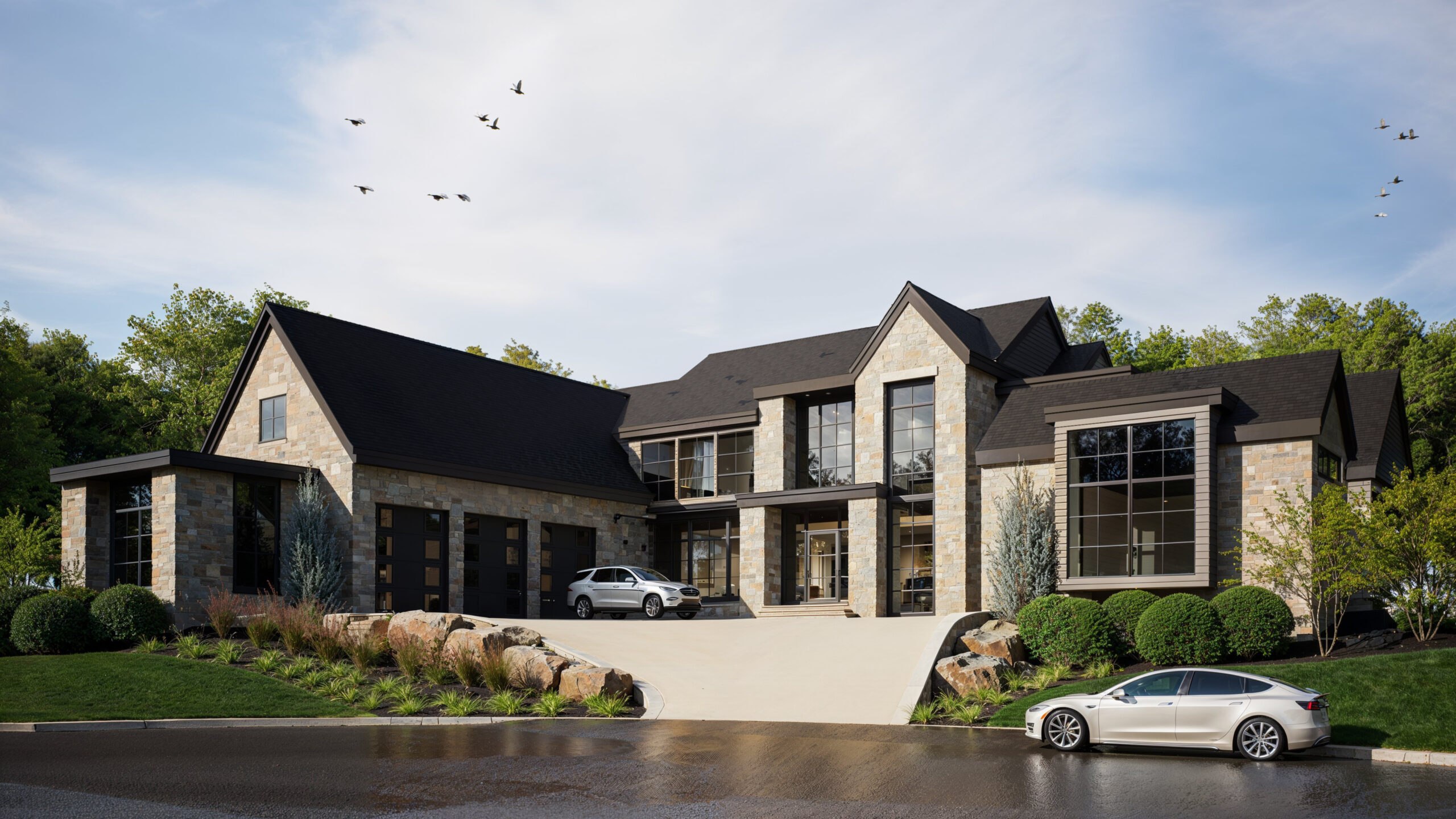 Currently under construction, this unique design overcame a lot that slopes forward rather than rearward, yet still has views over the Holliday Farms golf course.